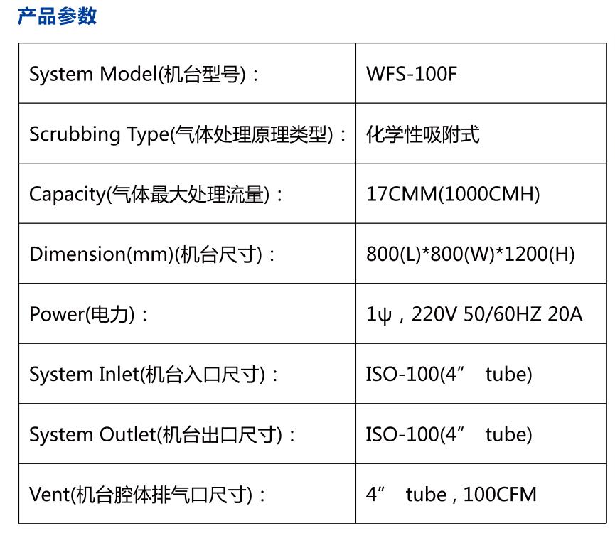WFS-100F吸附式local scrubber 尾氣處理設(shè)備可處理氣體種類包括半導(dǎo)體、液晶以及太陽能等行業(yè)中蝕刻制程與化學(xué)氣相沉積制程中使用的特氣,主要包括SiH4、SiH2Cl2、PH3、B2H6、TEOS、H2、CO、NF3、SF6、C2F6、WF6、NH3、N2O等。