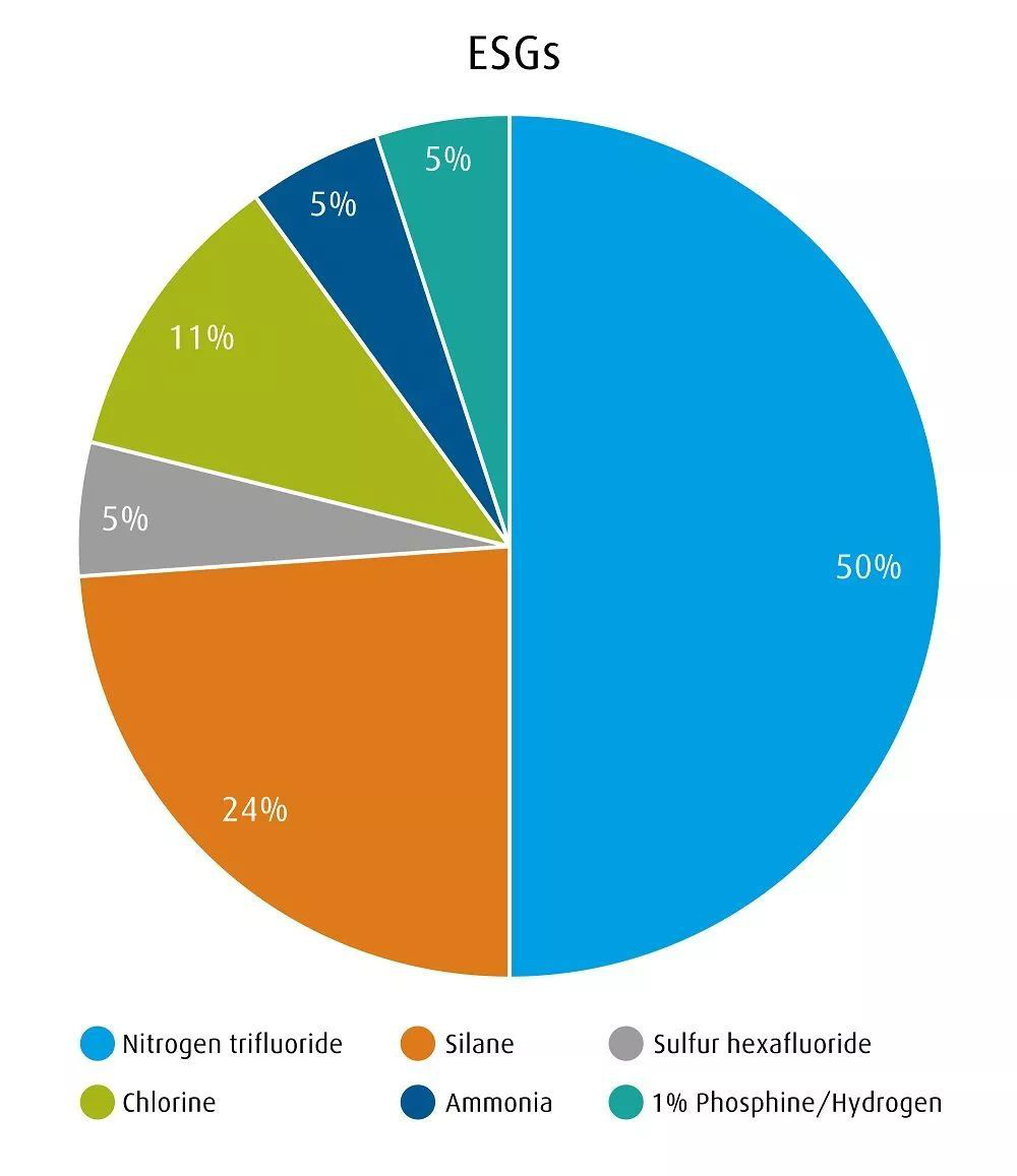 這些氣體中電子特種氣體(ESG)包括硅烷、三氟化氮、氟(現(xiàn)場(chǎng)產(chǎn)生)、六氟化硫、氨氣以及磷化氫混合物,占顯示屏制造中使用氣體的52%。比如硅烷:SiH4是顯示屏制造中最關(guān)鍵的氣體之一,與氨氣(NH3)結(jié)合使用,形成用于非晶硅(a-Si)晶體管的氮化硅層,與氮?dú)猓∟2)結(jié)合使用,形成用于低溫多晶硅(LTPS)晶體管的預(yù)準(zhǔn)分子激光退火非晶硅(a-Si),或與氧化亞氮(N2O)結(jié)合使用形成金屬氧化物(MO)晶體管的氧化硅層。