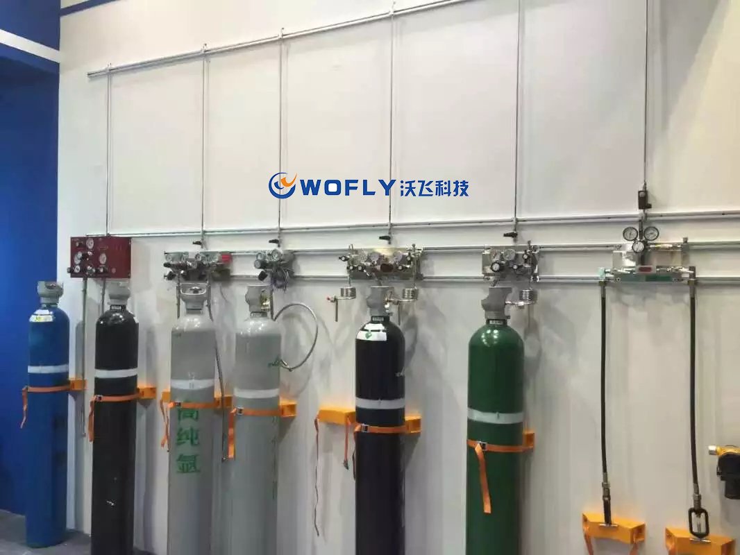 3、再次是解決氣瓶壓力的問題。每種氣體可以將多瓶氣體并聯(lián)然后通過一個出口統(tǒng)一減壓后運(yùn)送氣體至使用點(diǎn)。因?yàn)闅馄块g是相對獨(dú)立的,整個氣路系統(tǒng)壓力最大的地方也是氣瓶出口處,因此這種方式將氣瓶壓力可能發(fā)生的危險(xiǎn)縮小至氣瓶間內(nèi),可對人體及儀器的傷害可降到最低。