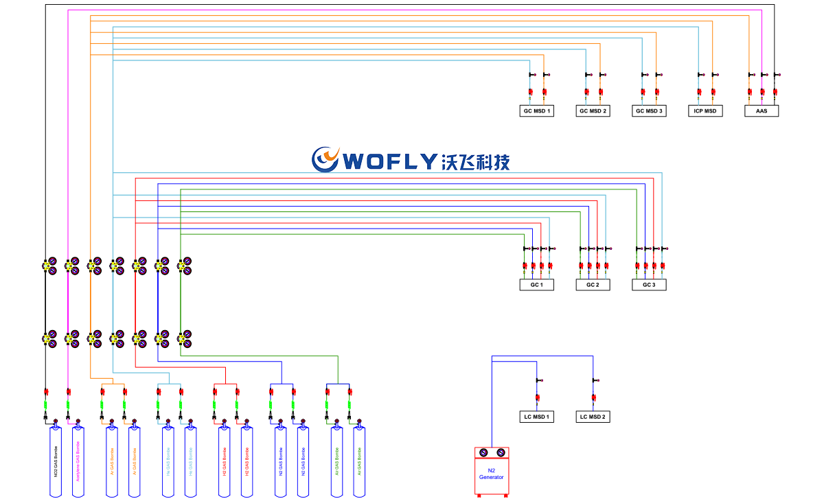 1、 分散供氣是將氣瓶或氣體發(fā)生器分別放在各個儀器分析室